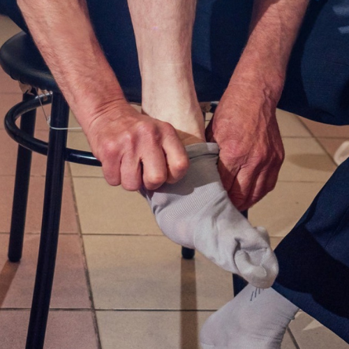 Lower back pain makes bending down difficult, but socks still have to be put on every day